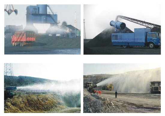 風送式遠程地麵(miàn)噴霧降塵係統(tǒng)利用高峰壓(yā),大流量(liàng)專用軸流(liú)風機驅動,通過導流風筒,形成高速氣流,撞擊(jī)破碎安裝在風筒(tǒng)出口的噴嘴,形成霧化粒度高(100um)射程遠(100米),指向性(xìng)強的霧流。
