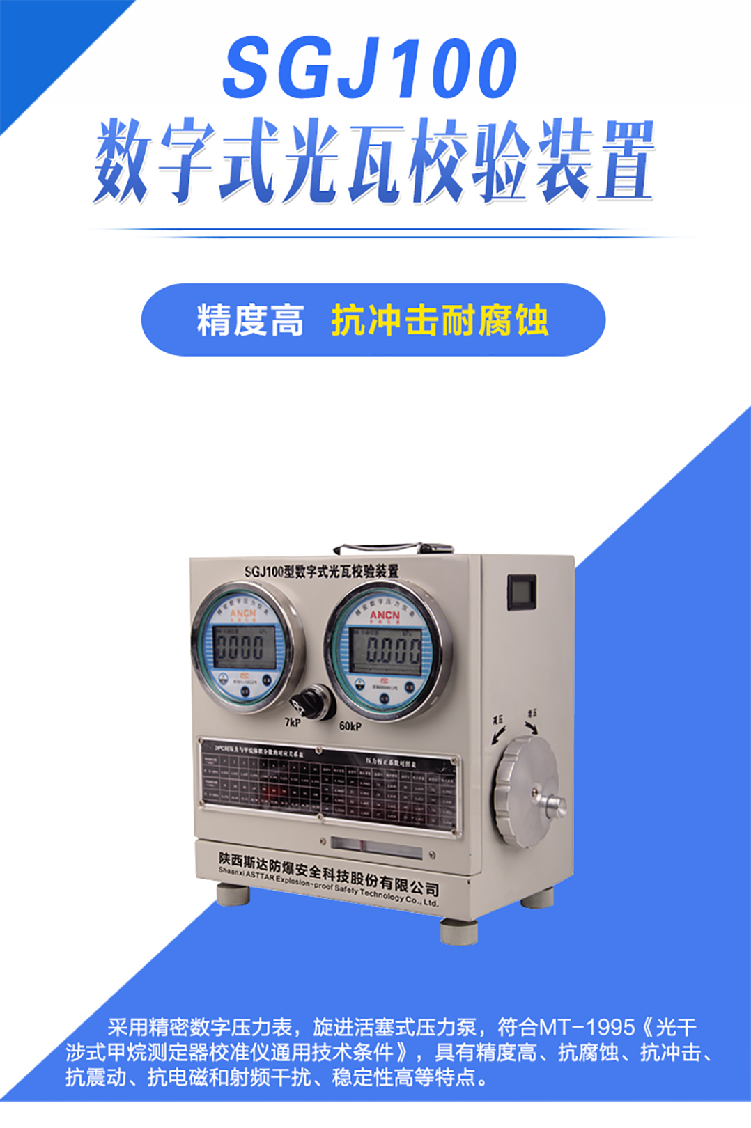 采用精密數字壓力(lì)表,旋進活塞式壓力泵,符合(hé)MT-1995《光幹涉式甲烷測定器校準儀通(tōng)用技術條件》,具有精度高、抗腐蝕(shí)、抗衝擊、抗(kàng)震(zhèn)動、抗電磁和射(shè)頻幹擾、穩定性高等特點。